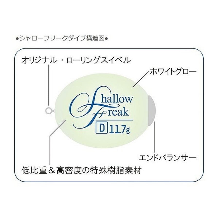 「シャローエリアを広範囲に探りたい」「さらに遠くのポイントを攻略するための飛距離がほしい」「バイトだけでなくルアーの動きを確実に感じ、ストレスなく自然に演出したい」さらに「レンジを完全掌握した攻略がしたい…」そんなアングラーの要求を満たしてくれるのがブランドビルダー藤原真一郎考案の『Fシステム』であり、全層完全掌握が可能なシンキングフロート『シャローフリーク Dive』です。●空気抵抗と飛行姿勢、着水後の安定性を計算したオーバル形状。●使用頻度の高い絶妙な沈下速度で設定されたシンキングモデル。●「飛距離」「自重」「体積」のバランスにこだわった構造設計。●蓄光量を調整したグローカラーは、夜間での視認性も重視。