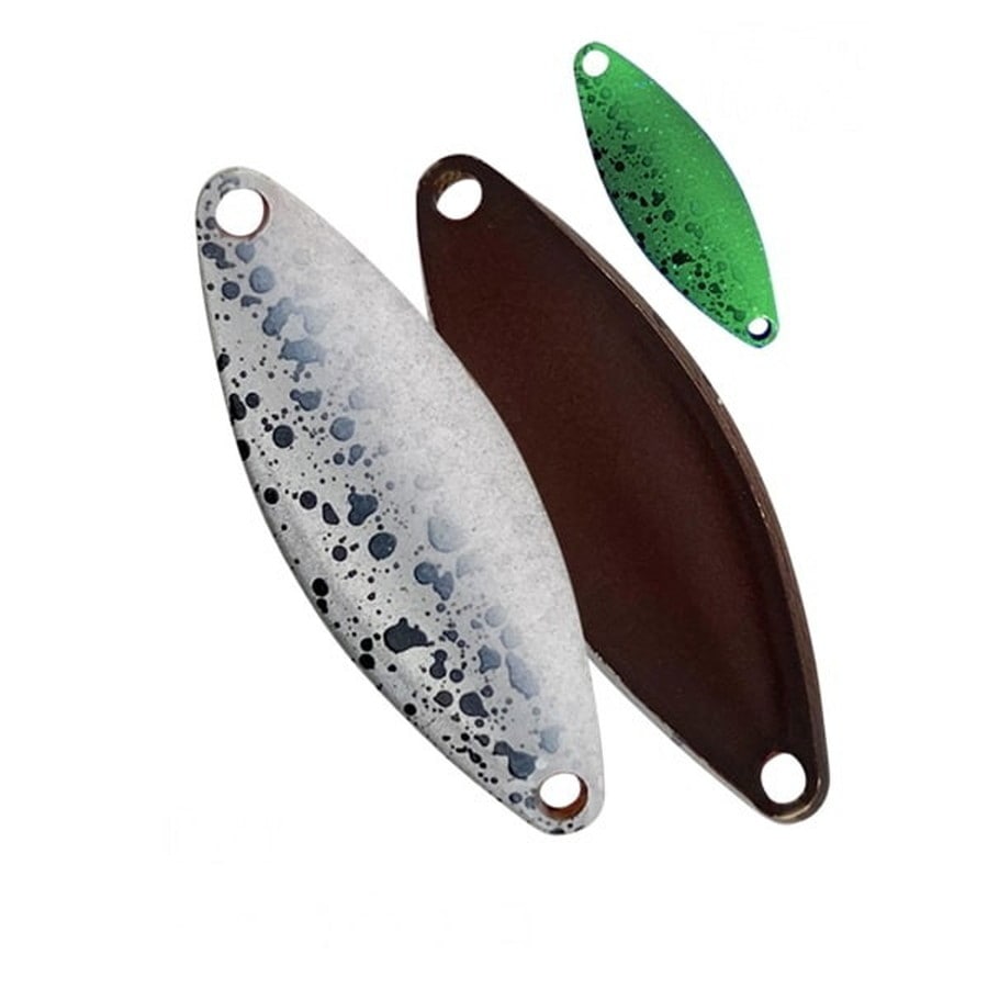 ポルコ最大の強みは、魚を飽きさせない異なる3つのアクションをスムーズに変化させられる点にある。基本アクションはウォブンロールだが、リトリーブ速度を落としていくと途切れることなく自然なローリングアクションへとスイッチする。またロッド角度を上げることでスタンドアップ(立ち泳ぎ)ロールアクションを演出することができる。このスタンドアップロールアクションを軸に戦略を立てれば、魚の目線から見たスプーンのシルエットに変化を与えられ、さらにはロッドを上下させる操作をプラスすればバーティカルな誘いを仕掛けることが可能となる。これにより、たとえ相手が喰い渋るトラウトであっても目先でアクションとシルエットに連続した変化を与えることでルアーとの距離を詰めさせ口を使わせるメソッドが成立する。警戒心を与えにくい洗練された細身のフォルムは、空気抵抗を軽減させた抜群の飛距離・浮き上がりを抑えた安定したレンジキープ力・フッキング時にはスプーンの暴れを抑制し、フッキングミスを軽減するなど計算された設計となっている。★重量(g):1.2