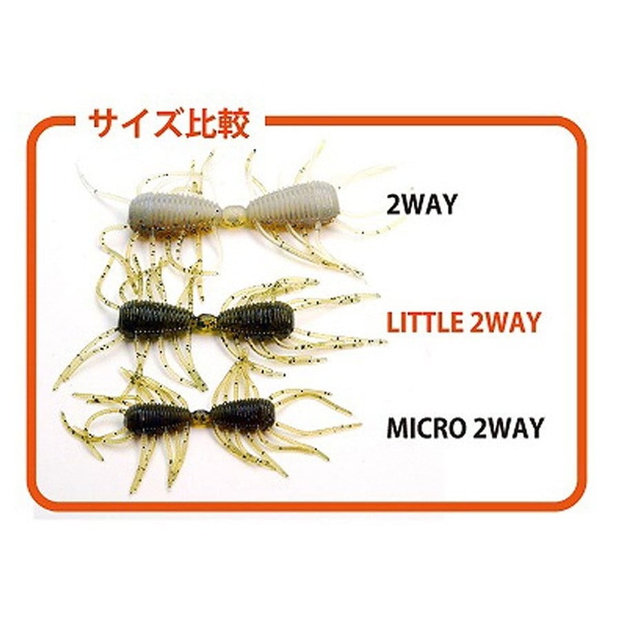 リトルサイズの2WAY誕生。2WAYはその名が示す通り魚の状態やシチュエーションに合わせて幾通りもの使い方ができるソフトベイトです。最もオーソドックスな使用法は、そのままセンターの球体部にマスバリを掛けたショートリーダーダウンショット。シンカーを上下させるイメージでややゆったりと大き目にアクションを加えることで、ボディが「くの字」に折れ曲がりながらロールすることで多軸的ロールアクションを起こし、ボディサイドから無数に生えた細いレッグが追従するため、極めて複雑怪奇なアクションを発生します。また、小粒ボディサイズとは思えないブレーキ感とウォーターグリップ力、水押しを実現。ジグヘッドワッキーにリグることで、ダイレクト感や手返しの良さを得ると同時にカバー周りでも使うことが可能になります。なかなか反応を示さない魚に対する別アプローチとして、半分に千切ったボディにマスバリをセットしたネイルリグが効果的。フォール時にボディサイドのレッグがピリピリと微細波動を発しいわゆる沈ませる虫ワームとしても使用することができます。
