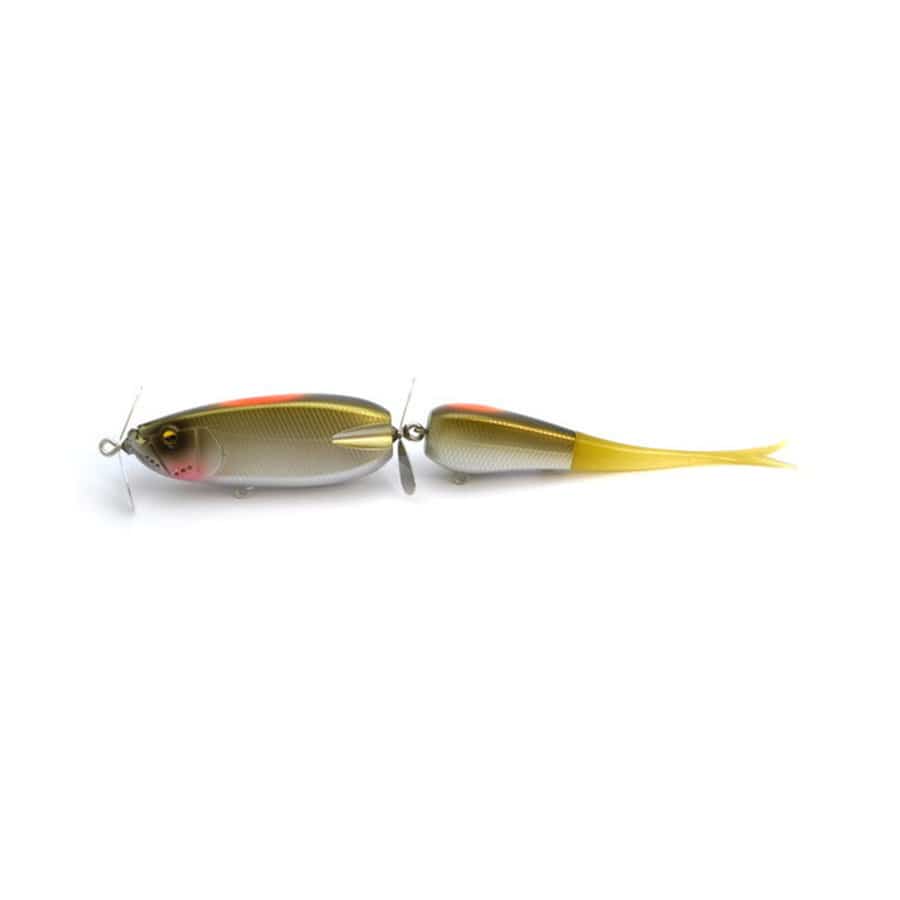 DOUBLE HEADERは、ボディフロントとジョイント部にペラを設置した、これまでにないまったく新しいスタイルのダブルスウィッシャー型ジョイントビッグベイトです。ストレートリトリーブでは前後のペラが回転するi字系大型ダブルスウィッシャーとして水面からサブサーフェスのレンジをトレースできます。(板オモリによるウェイト調整で任意のレンジをトレース可能)また、ロッドワークを加えれば、従来のダブルスウィッシャーが苦手とした左右への首振りを誰でも簡単に演出することが可能。線の誘いだけでなく点の誘いにも優れる革新的なプロップベイトです。