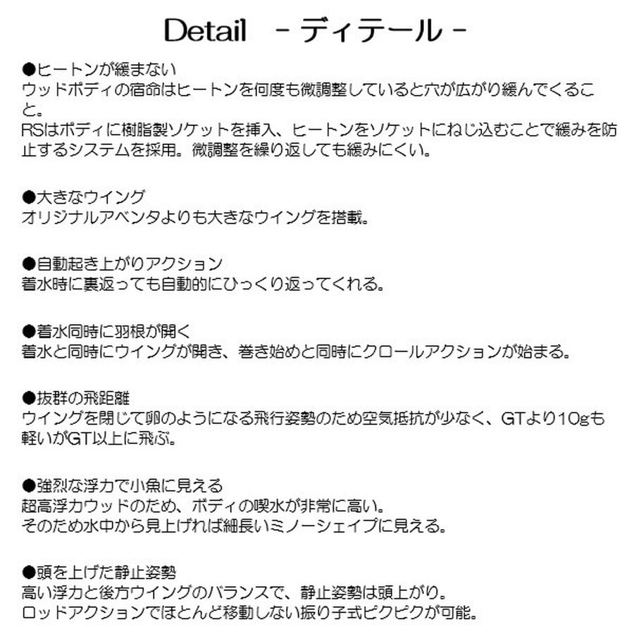 弾丸的直進遠投性、超超低速クロール、全自動起き上がりアクション・・・etc。特殊ウッド採用だから成し得た異次元のデッドスローアクション、アベンタクローラーRS登場! 超低速特化型クローラーベイトデッドスロー・クロールアクション性能を突き詰めたアベンタクローラーを特殊ウッド素材でリメイクし、さらなるアルティメットデッドスローアクションベイトとしたのが、「アベンタクローラー・ウッドモデル」です。ウッドモデルには使用ウッド素材の違いにより、デッドスローアクションはそのままに飛距離、キャストアキュラシーを極めた「GT」モデルと、さらなるスローアクションを追求した「RS」モデルがあります。使う場所や状況によって使い分けていただくと、さらにアベンタクローラー・ウッドモデルの能力を引き出すことができます。