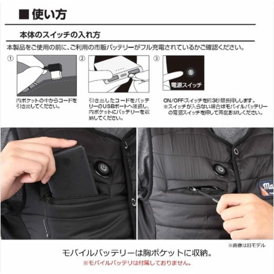 「真冬でも重ね着はしたくない。軽装でいたい。でも、暖かさは絶対条件。」 多くのアングラーが抱く、『この理想』を妥協なく追求し、形にしたのがヒーターベストです。表生地には耐久性と保温性に優れたリップストップ生地を採用。前モデルより中綿を少なくしたことで重ね着をしても着膨れすることなく、インナーとしての自由度が増しました。本作から新たに「ホールド機能」を搭載しました。これはメインスイッチ横のボタンを押すことで、その時の出力(温度)を固定する機能です。ホールド中はメインスイッチが反応しないので、気付かないうちにスイッチをどこかにぶつけて電源が切れたり、温度が変わることを防ぎます。スイッチは胸の高さに配置してあるので、アウターを着た状態でも操作が簡単に行えます。※モバイルバッテリーは別売です。容量:10000mAh 出力:5V/2A以上のスペックの使用を推奨しております。温度は3段階調整。スイッチのカラーで強弱が判別できます。
