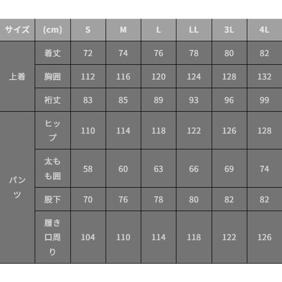 サイズ:M・上着(着丈74cm、胸囲116cm、裄丈85cm)パンツ(ヒップ114cm、太もも囲60cm、股下76cm、履き口回り110cm)