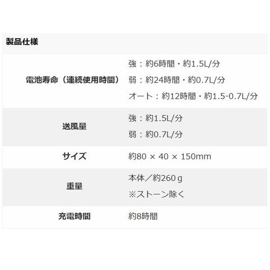 サイズ:約80×40×150mm 重量: 本体/約260g※ストーン除く 充電時間:約8時間