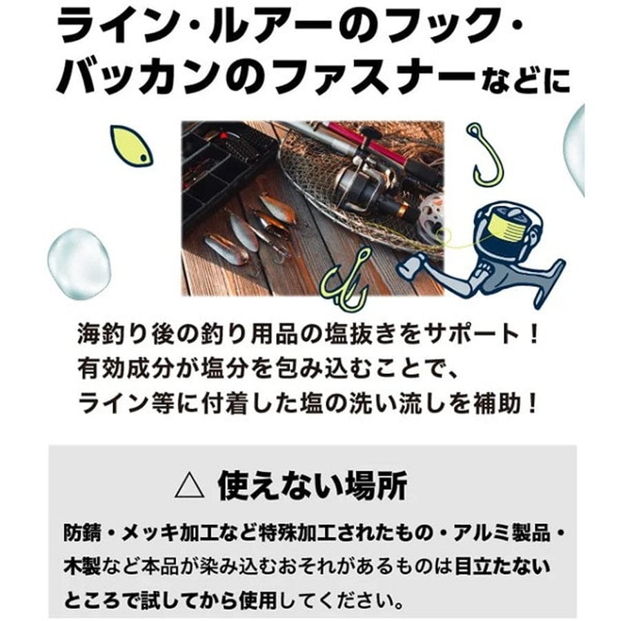 水洗いだけでは抜けきらないソルトの塩ガミ・サビ対策に最適。有効成分が塩分を包み込むことで、ライン等に付着した塩の洗い流しを補助。