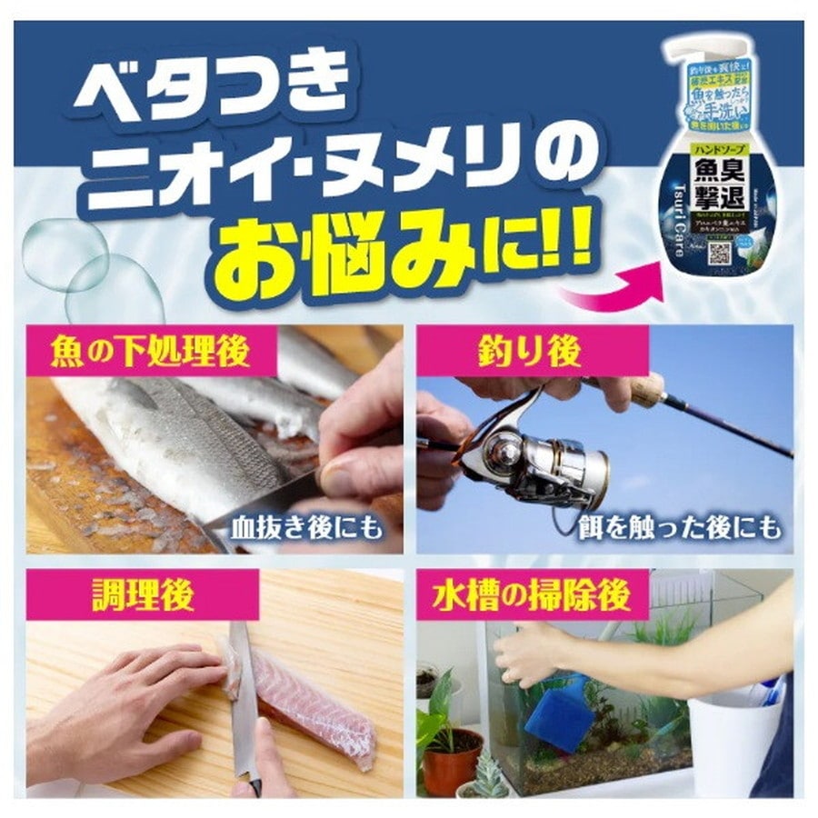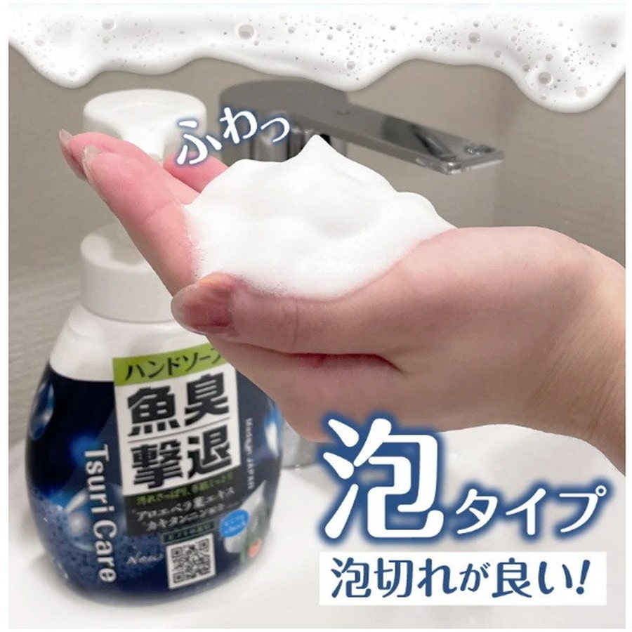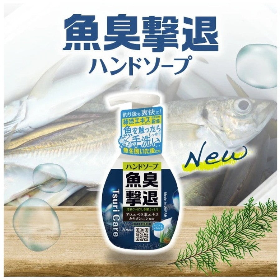 魚を触った後の手洗いに最適!魚の脂や魚臭をさっぱり洗い落とします。アロエベラ葉エキス・カキタンニン配合 (保湿剤)で、手肌にうるおいを与えます。泡で出るヒノキの香りのハンドソープです。