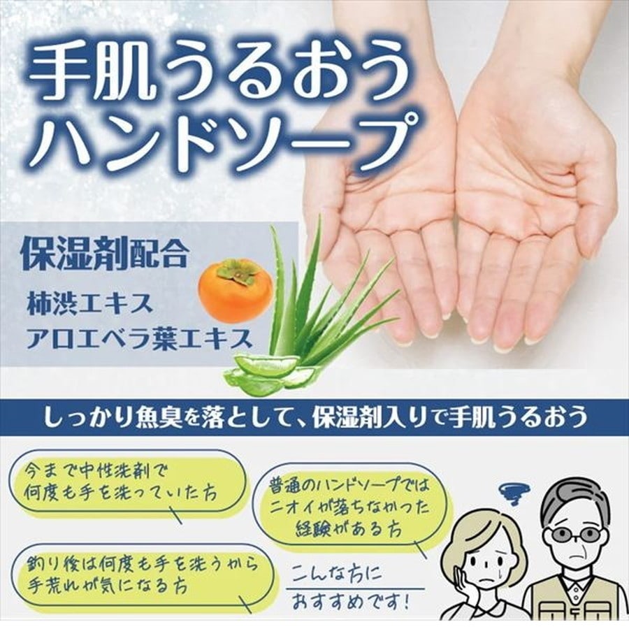 魚を触った後の手洗いに最適!魚の脂や魚臭をさっぱり洗い落とします。アロエベラ葉エキス・カキタンニン配合 (保湿剤)で、手肌にうるおいを与えます。泡で出るヒノキの香りのハンドソープです。つめかえ用