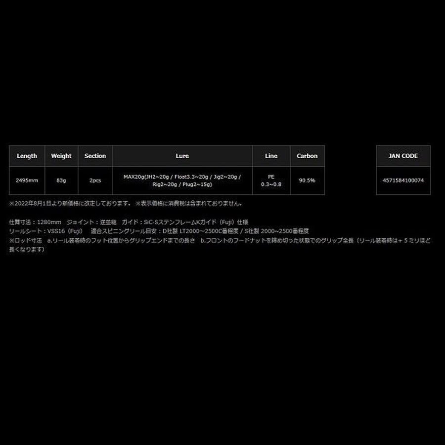 全長:2495mm 仕舞寸法:1280mm 自重:83g 継数:2ピース(逆並継) ルアー:MAX20g(ジグヘッド2~20g/フロート3.3~20g/ジグ2~20g/リグ2~20g/プラグ2~15g) ライン:PE0.3~0.8 カーボン:90.5% グリップ寸法:a.325mm/b.390mm ※a.リール装着時のフット位置からグリップエンドまでの長さ/b.ハンドル全長 ●推奨ターゲット:アジ・メバル・クロダイ・シーバス・ロックフィッシュ・他なんでも ●推奨ルアー:メタルジグ・プラグ・各種リグ・ジグヘッド ●推奨フィールド:港湾・磯・河口・サーフなど ●適合リール:D社LT2000~2500C/S社2000~2500 ※実物と色が違って見える場合があります。あらかじめご了承下さい。
