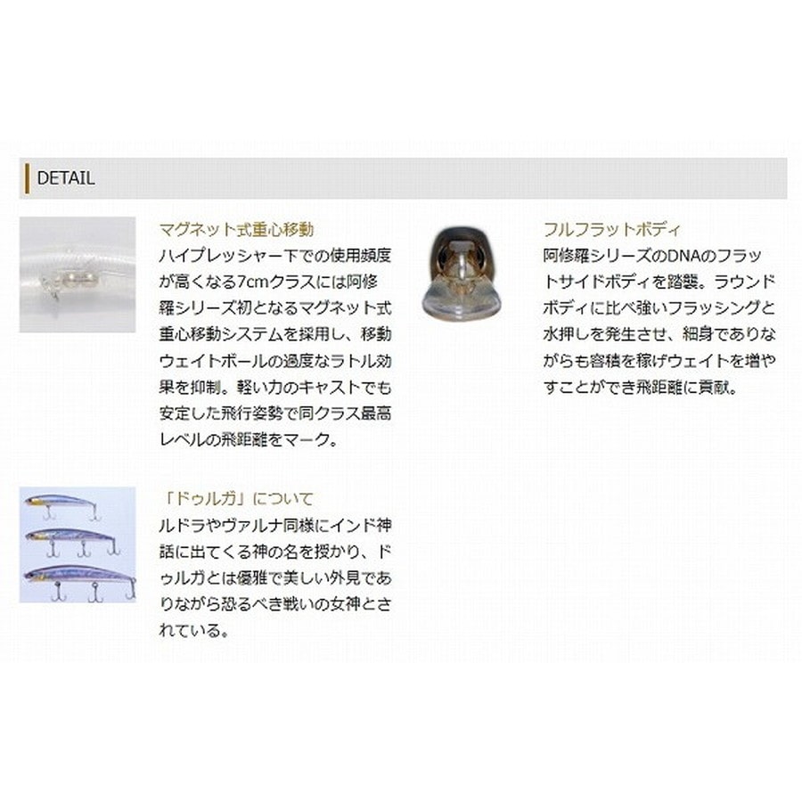 7cmクラスのミノーはフィールドや季節を問わずワカサギやオイカワといったベイトフィッシュサイズにジャストマッチで時に爆発的な釣果をもたらす。しかしミノー特有の細身のシルエットは十分な重量を確保する事が困難で飛びづらく、スピニングタックルでしかまともに扱えなかった。「阿修羅O.S.Pドゥルガ73」は同クラス競合ミノーのみならずシャローレンジのシャッドを使うようなシチュエーションにも対応出来るよう、ベイトフィネスタックルでも扱え、飛距離、アクションレスポンス、アングラーへ伝える操作感といった基本性能を高次元にクリアしたスタンダードミノーである。プレッシャーを極力抑える為のロングアプローチや、陸っぱりで遠くの狙いたいスポットに撃ち込んだりサンドバーなどのフィーディングスポットを広範囲にサーチするといった、釣果を左右する飛距離は同クラス最高レベルをマーク。ハイプレッシャー下での使用頻度が高くなる7cmクラスには阿修羅シリーズ初となるマグネット式重心移動システムを採用し、移動ウェイトボールの過度なラトル効果を抑制させた。#8フックの搭載は例えば消波ブロックといったストラクチャー周りでベイトフィネスタックル&太めのラインも扱える安心のミノーゲームを可能にし、それでいてフックが背中に乗ってしまうトラブルも皆無。ベイトフィッシュが泳ぐ水平姿勢を再現しスレきったバスでさえ思わずバイトさせてしまう。スローからファストリトリーブまで対応したハイピッチウォブンロールはロッドティップに振動を明確に伝え、水中の浮遊物を拾えば違和感を伝えルアーがどのような状態かを的確に把握可能にする。トゥイッチでは左右にキレよくフラッシングを伴いながらダートし、時に身をくねらせながら水面方向へ上昇するイレギュラーダートも見せバスの捕食スイッチを刺激。使い易くて釣る為の性能を高次元に高めたドゥルガは7cmクラスのミノー戦略を再構築する。