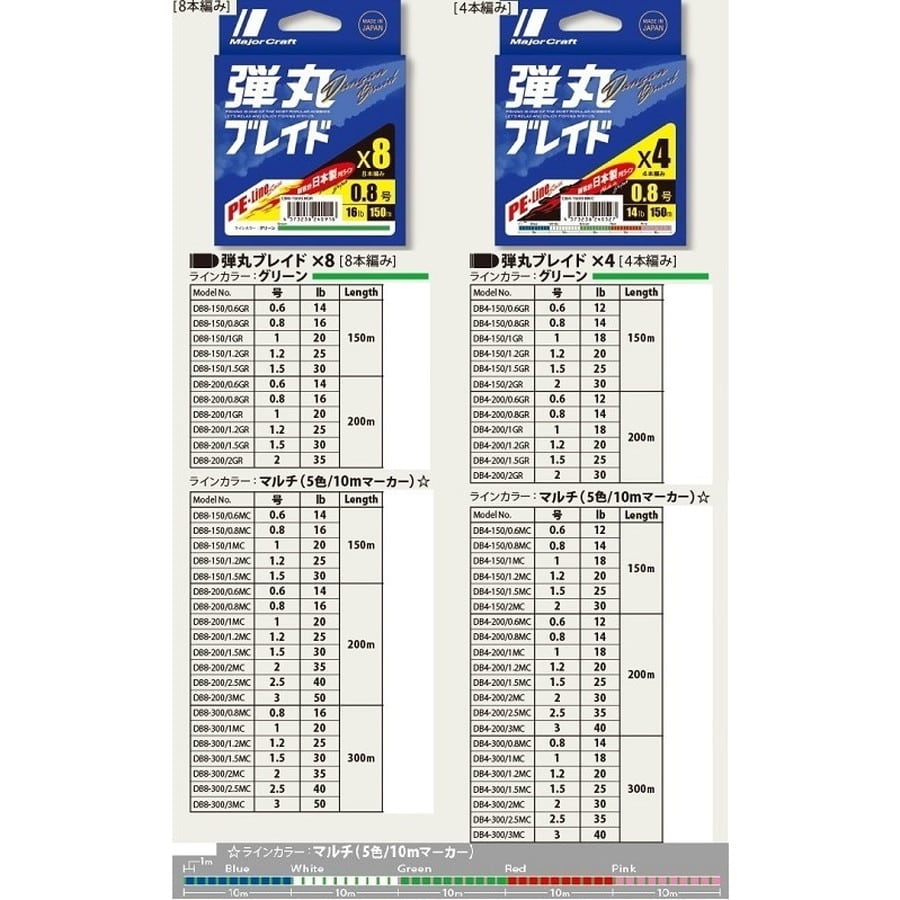 日本製 扱いやすいよう表面をコーティング:初心者でも使いやすいように表面をコーティング。適度なハリを持たせることで、あらゆる釣りに対応しガイドへの糸絡み等ライントラブルを軽減しています。 ラインカラー:ショアゲームで活躍する視認性に優れた単色タイプと、オフショアゲームに有利な1m毎のマーカー付き5色マーカータイプ(10mマーカータイプ)をラインナップ。 4本編み 号数/lb:0.8号/14lb ラインカラー:1m毎のマーカー付き5色マルチカラー 300m巻