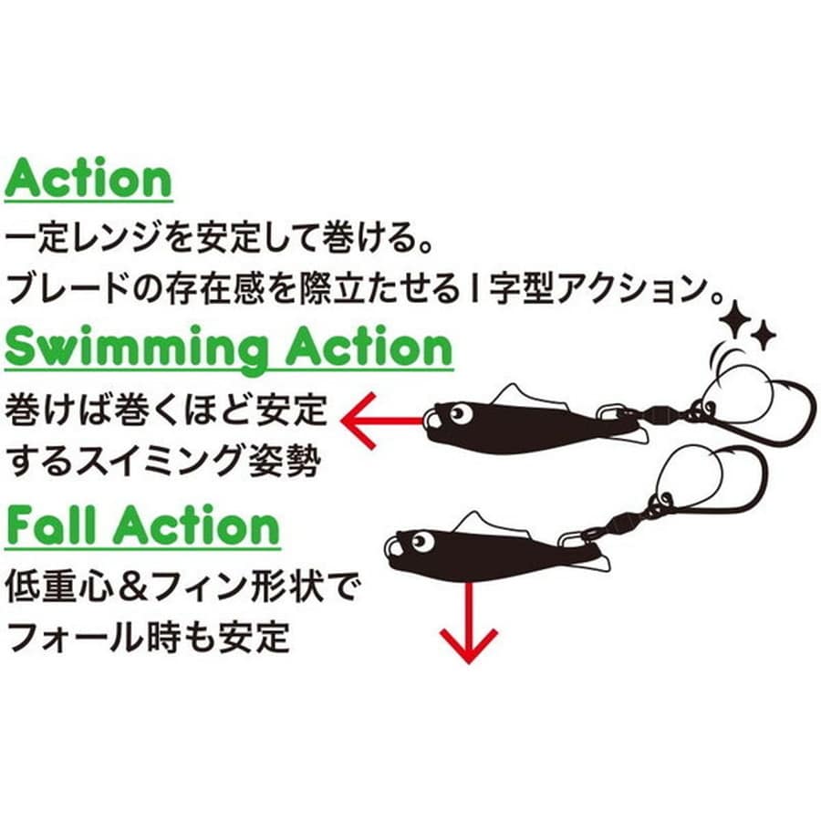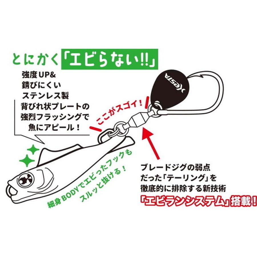 ブレード系ジグにありがちなテーリング現象、通称エビ状態。この状態になってしまうとせっかくキャストしても思い通りのアクションが発生しないばかりかサワラなどの鋭い歯を持つ魚がミスバイトしてしまいロストする可能性がある。エビランは名の通りエビ状態のメカニズムを徹底的に研究し、状況に関わらずテーリングを自動的に解除する『エビランシステム』をボディに搭載。アクションは高速巻きしてもブレの少ないI字系のアクションとブレードの強烈なフラッシングが青物から根魚、マダイなど様々な魚種に対応する。ライトショアジギングやSLSだけでなくライトなオフショアゲームなど様々なシーンで活躍するブレードジグがついに完成。