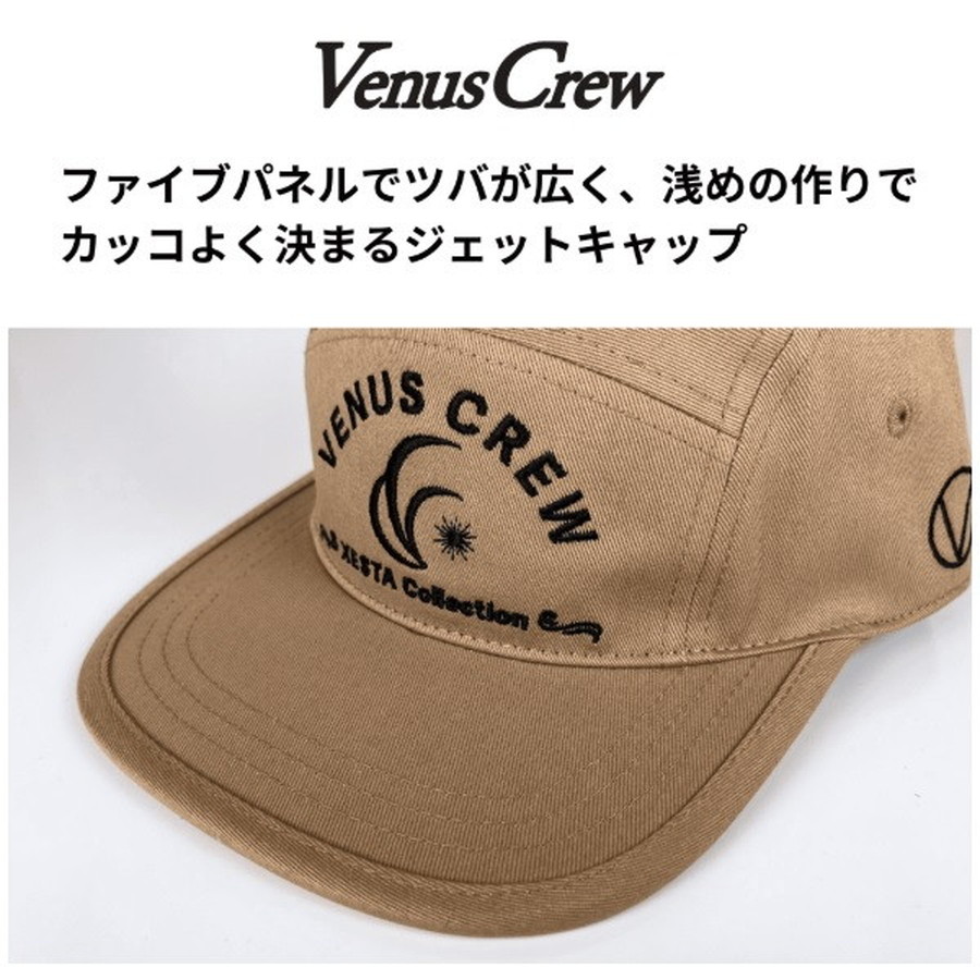ファイブパネル構造で広めのツバが特徴的なVenusCrewジェットキャップです。一般的なキャップに比べると浅めの作りなので、ジェットキャップならではの軽やかで爽やかな印象が魅力的。マジックテープアジャスターが付いているので、誰にでも快適にフィットします。アウトドアとタウンユースの両方で活躍する機能的かつおしゃれなキャップなので、ぜひ一つ持っていて欲しい逸品です。