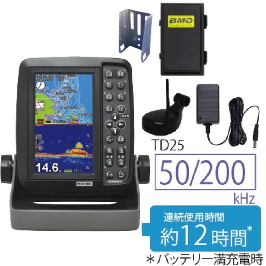 タイプ:5型ワイド液晶 表示画面:縦型 電源電圧:DC11~14V 消費電力/電流:約4W 約0.3A/12V 本体寸法:W173×D191×H173mm 本体重量:約0.7kg セット内容:本体(ケースカバー付き)、振動子 TD25(3P-8m)、振動子取付金具、BMOバッテリーパック(専用チャージャー付)