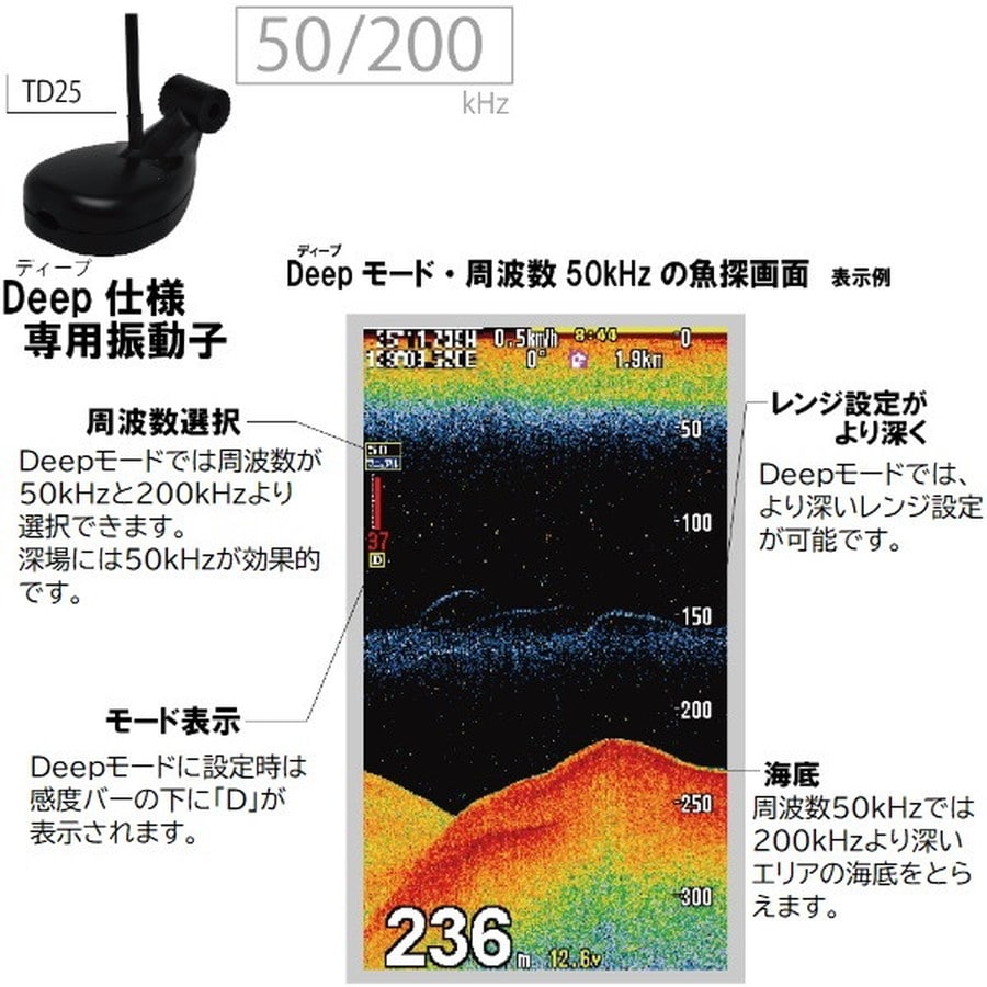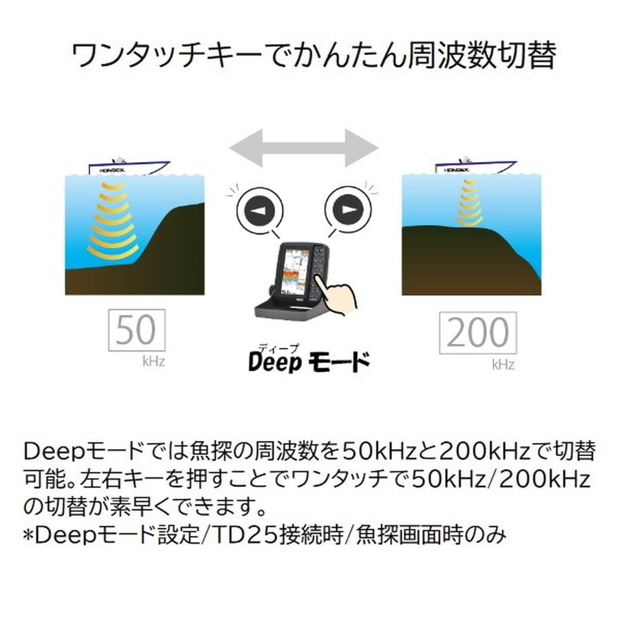 楽しく・手軽に魚探をはじめられる!HONDEXのPSシリーズ。PSシリーズはコンパクトなサイズ、使いやすい操作で、魚探がはじめての方でも安心して使うことができるシリーズです。◆新機能!Deepモード搭載。使用する水深に応じて本体のモードを切替可能。魚探モードを「ディープ」に設定し、振動子TD25を接続すると魚探周波数を50kHzと200kHzから選択できるようになります。50kHzは200kHzよりもさらに深い水深まで届く特性があり、200kHzが届かないようなエリアでの釣りに大変役立ちます。