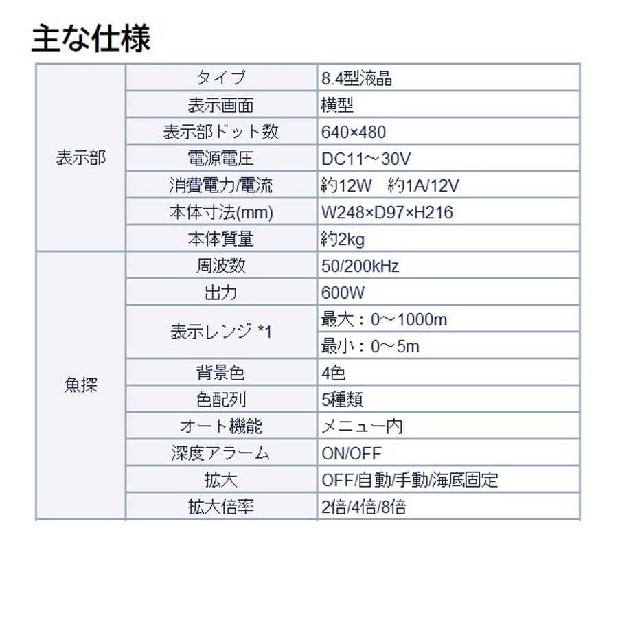 分かりやすい操作で迷わず使いこなせるカンタンナビ!見やすくて使いやすい操作部と分かりやすいシンプルなメニュー画面で、初心者の方でも迷わずかんたんに操作できます。◆大きなボタンで押し間違いによる操作ミスを減らします。◆大きく見やすい日本語文字表記でスムーズに操作できます。◆操作しやすいボタン配置。魚探操作用ボタン/プロッター操作用ボタンのエリアを明確にし、ストレスのない操作を可能にしました。★タイプ:8.4型液晶 表示画面:横型 電源電圧:DC11~30V 消費電力/電流:約12W 約1A/12V 本体寸法:W248×D97×H216mm 本体重量:約2kg 標準装備品:本体&架台、振動子:TD25(3P)、電源コード:DC06(2P-2m)、ハードカバー:CV11