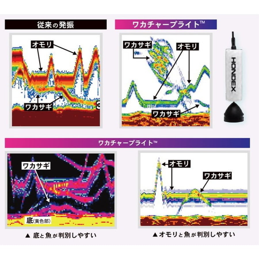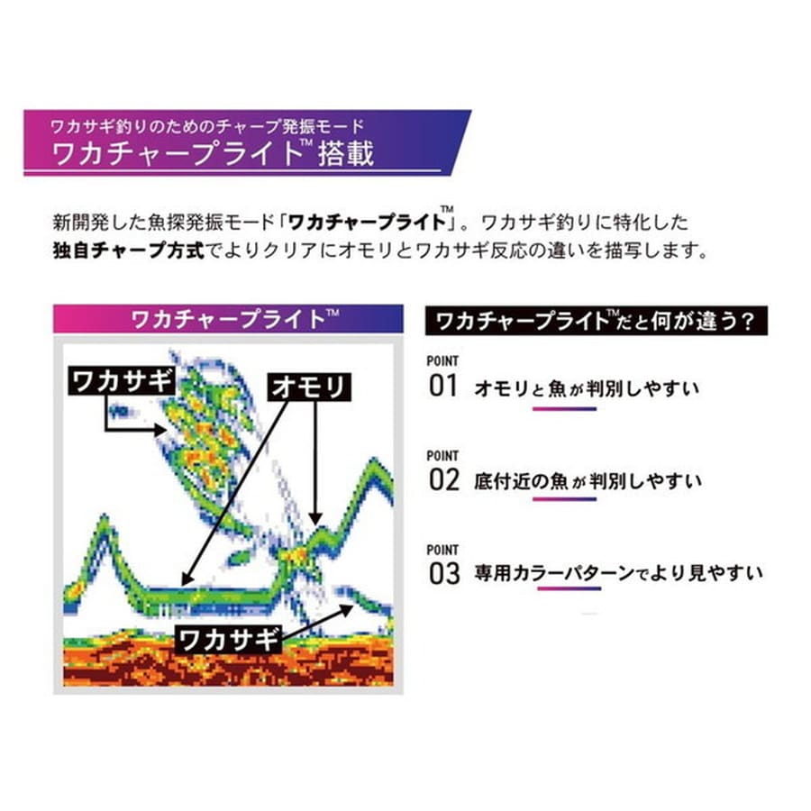 ワカサギ釣り専用振動子TD08がセットになったPS-711CNワカサギパックはワカサギモードを搭載。これだけでワカサギ仕様に切り替わり!ワカサギ釣りに特化した複数の魚探機能が使用可能になるモードです。専用開発した魚探発振モード「ワカチャープライト(TM)」は、TD08の性能を最大限に引き出す独自チャープ方式により、今まで表現しづらかったオモリとの反応の違いや、底付近に潜む小さなワカサギの反応まで鮮明に描写。厳しいコンディションでもターゲットを逃しません。またワカチャープライト(TM)の特性に合わせた専用カラーを新開発。ボトム周辺での微細な反応差やワカサギ反応の強弱が視覚的により分かりやすくなりました。釣果を追求する大画面7型ワイド液晶は、従来の5型ワイドモデルと比較すると画面はより広くより鮮明に、微細な反応も表現します。