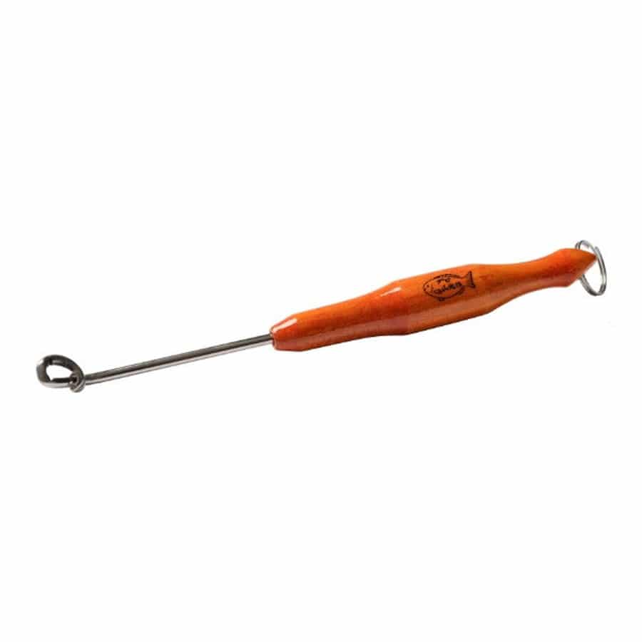 特に渡船に乗っている時など、ベストからハリ外しをぶら下げていると、ロッドケースから出ているような玉アミに金具部が引っ掛かってしまうことがあります。この玉アミ、ハリス絡み防止リングがあることで、金具部先端のラインを通す隙間をロックし、玉アミや不意にラインなどが引っ掛からないようにしています。数釣りなどで頻繁にハリ外しを使用される方は、実際の使用時にリングをずらすのが煩わしく感じることがあるかと思います。※玉アミ、ハリス絡み防止リングは不要であれば、リングをペンチではさみ、軽くねじると簡単に外すことができます。★サイズ:約60mm(金具部分の長さ)