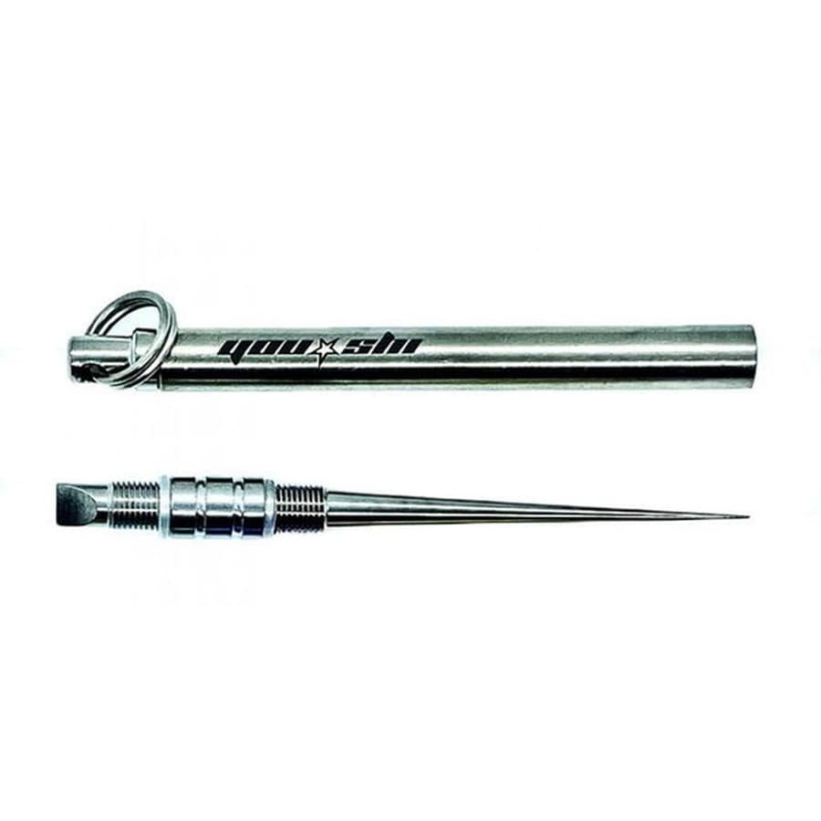 仕掛けが絡んだ時のおまつりほどきや、魚のこめかみへの一発締めとしても活躍。安全なパッキン付きカバーに収納でき、ピンオンリール等にぶら下げることが出来ます。鋭利な先端部もカバー(ゆるみ止めリング付)に守られ安心。PE釣法や、その他PEを使ったルアーフィッシング、鮎、渓流釣り等にも最適。使用時はカバーとジョイントして長くて持ちやすい状態で使えます。★サイズ:71(使用時120)x直径6.6mm