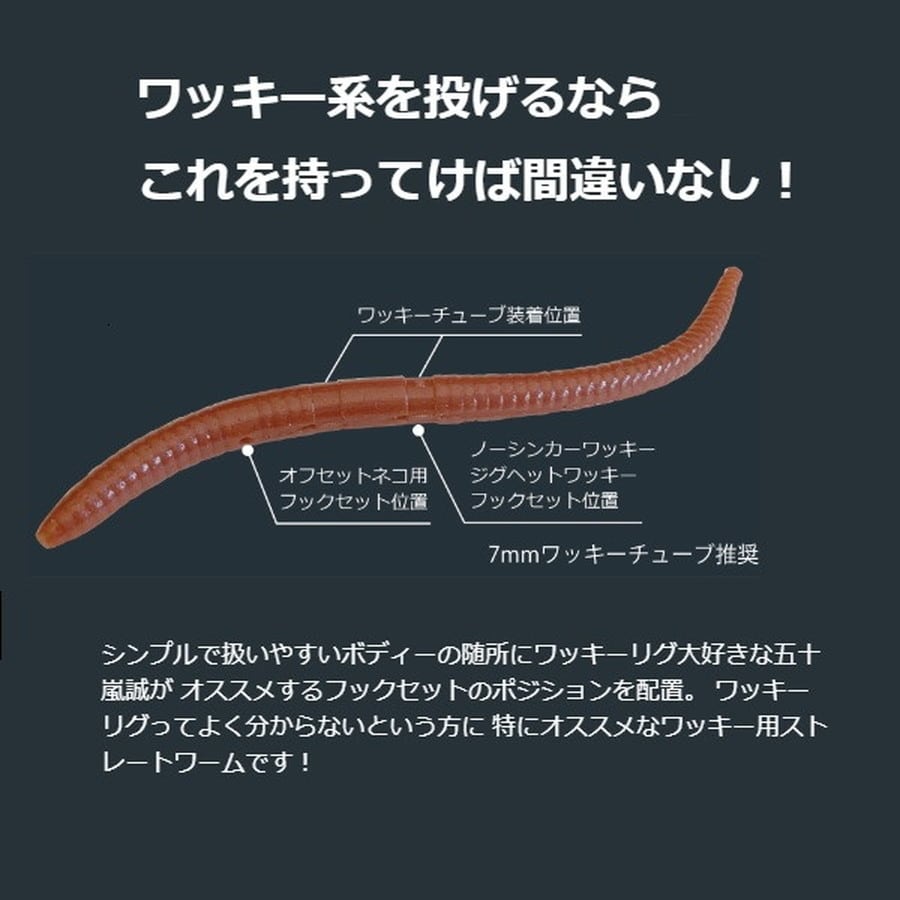 シンプルで扱いやすいボディーの随所にワッキーリグ大好きな五十嵐誠が オススメするフックセットのポジションを配置。 ワッキーリグってよく分からないという方に 特にオススメなワッキー用ストレートワームです!★全長:5inch
