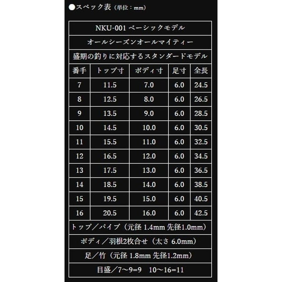 盛期の釣りに対応するスタンダードモデル。おもりの乗るボディ形状は素早く仕掛を落とし狙ったタナに的確にエサを届けます。竹足の特徴である復元力の強さと、太めのパイプトップによりゆっくりとした馴染み、戻りを演出します。★スペック表(単位:cm) トップ寸:16.5 ボディ寸:12.0 足寸:6.0 全長:34.5 トップ/パイプ(元径 1.4mm 先径1.0mm) ボディ/羽根2枚合せ(太さ 6.0mm) 足/竹(元径 1.8mm 先径1.2mm) 目盛/11