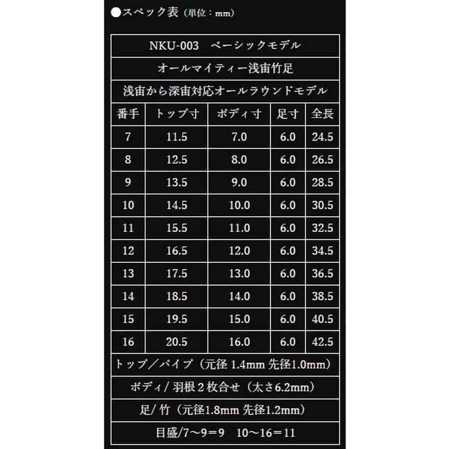 浅宙から深宙まで対応できるオールラウンドモデル。ストロークのあるトップで、馴染み際の触りを的確に捉えます。竹足の特徴である復元力の強さによって、ゆっくりとした馴染みが演出されます。★スペック表(単位:cm) トップ寸:20.5 ボディ寸:16.0 足寸:6.0 全長:42.5 トップ/パイプ(元径 1.4mm 先径1.0mm) ボディ/羽根2枚合せ(太さ 6.2mm) 足/竹(元径 1.8mm 先径1.2mm) 目盛/11