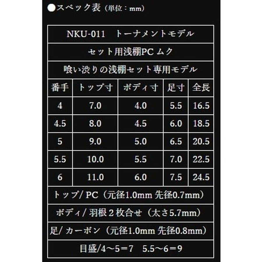 食い渋りの浅ダナセット専用モデル。抜きセットで肝となるクワセエサの微細なアオリが忠実に再現され、魚の状態を伝えてくれます。★スペック表(単位:cm) トップ寸:11.0 ボディ寸:6.0 足寸:7.5 全長:24.5 トップ/PC(元径 1.0mm 先径0.7mm) ボディ/羽根2枚合せ(太さ 5.7mm) 足/カーボン(元径 1.0mm 先径0.8mm) 目盛/9