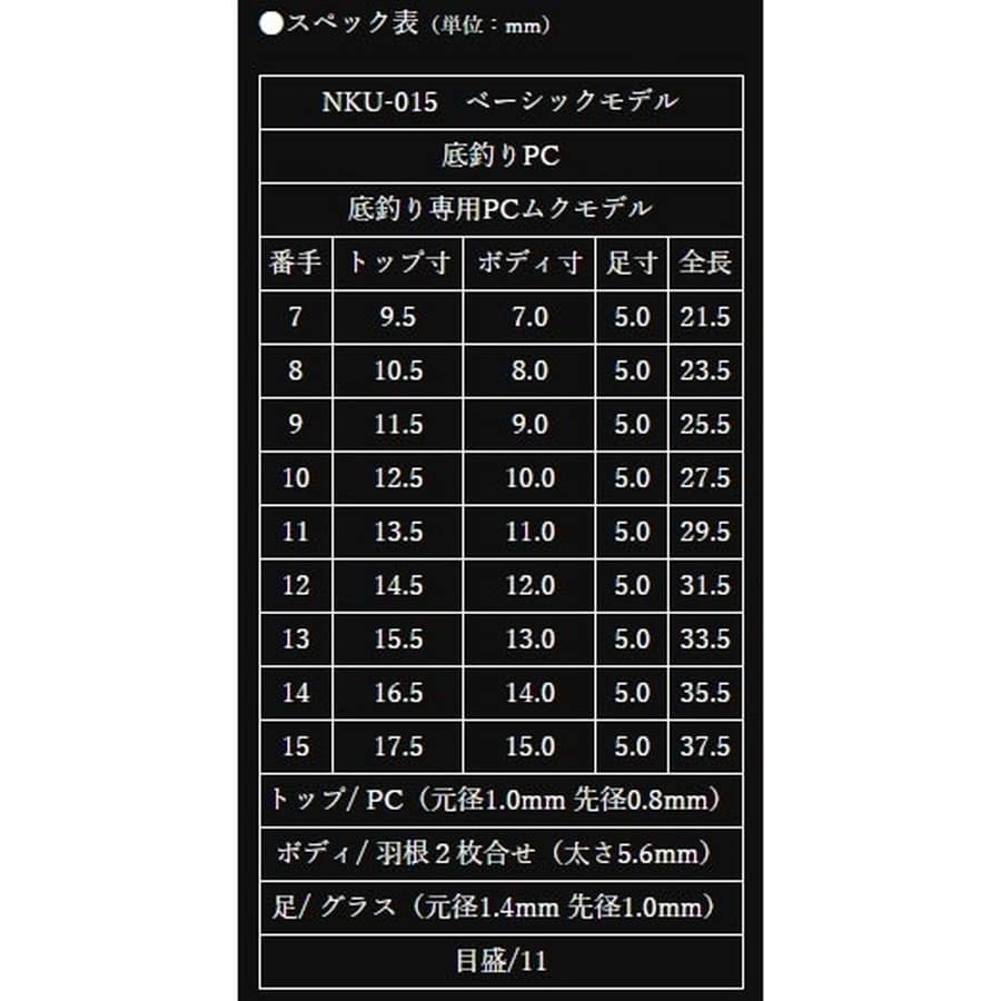 高活性時の両ダンゴや両グルテンに対応する底釣り専用モデル。サワリから連動した早いタイミングのアタリを捉えてくれます。先径0.8 のPCトップが底釣りで必要な戻りを演出。風やシモリに負けない安定感を備えるためにあえてソリッド足を採用しました。座りの良さが求められる厳寒期の段差の底釣りにも対応します。★スペック表(単位:cm) トップ寸:11.5 ボディ寸:9.0 足寸:5.0 全長:25.5 トップ/PC(元径 1.0mm 先径0.8mm) ボディ/羽根2枚合せ(太さ 5.6mm) 足/グラス(元径 1.4mm 先径1.0mm) 目盛/11