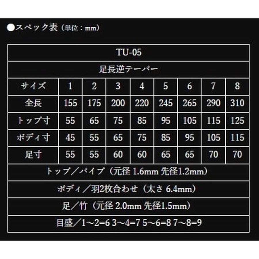 逆テーパー使用の為、少々重めのエサもトップ先端で支えてくれてゆっくりなじみます。★サイズ:2 スペック(単位:mm)全長:175 トップ寸:65 ボディ寸:55 足寸:55 トップ/パイプ(元径 1.6mm 先径1.2mm) ボディ/羽2枚合わせ(太さ 6.4mm) 足/竹(元径 2.0mm 先径1.5mm)目盛/6