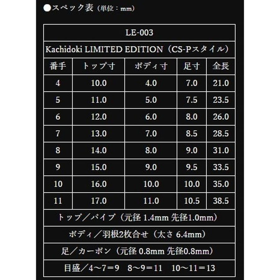 スペック表(単位:cm) トップ寸:16.0 ボディ寸:10.0 足寸:10.0 全長:35.0 トップ/パイプ(元径 1.4mm 先径1.0mm) ボディ/羽根2枚合せ(太さ 6.4mm) 足/カーボン(元径 0.8mm 先径0.8mm) 目盛/13