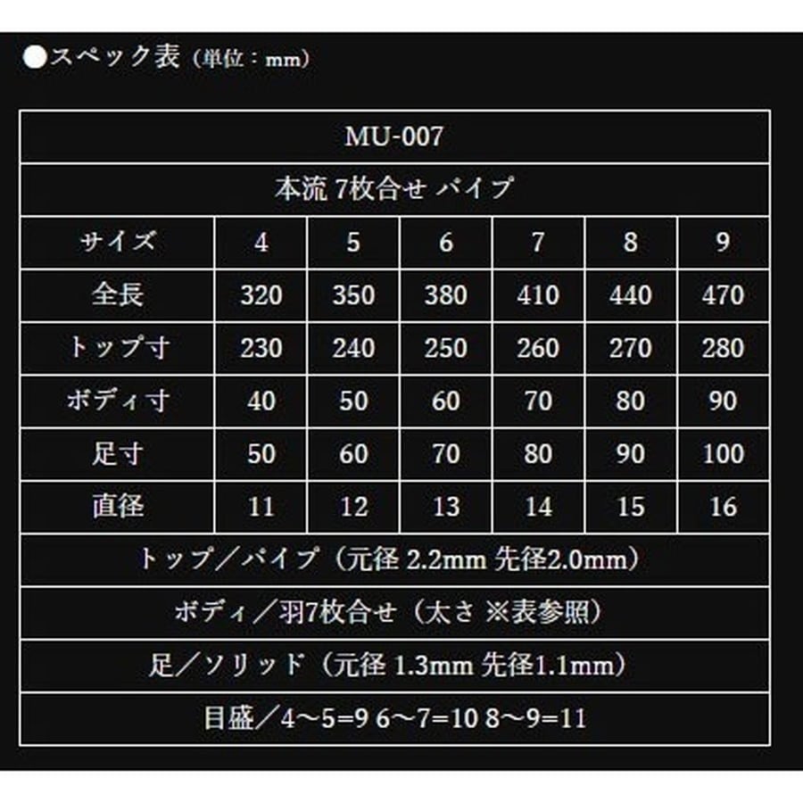 ドボン釣りに最適。 かんざしボディは流れに強くしもりにくい。 超長尺竿対応で視認性の高いパイプトップ使用。★サイズ:4 スペック(単位:mm)全長:320 トップ寸:230 ボディ寸:40 足寸:50 直径:11 トップ/パイプ(元径 2.2mm 先径2.0mm) ボディ/羽7枚合わせ(太さ 11mm) 足/ソリッド(元径 1.3mm 先径1.1mm)目盛/9