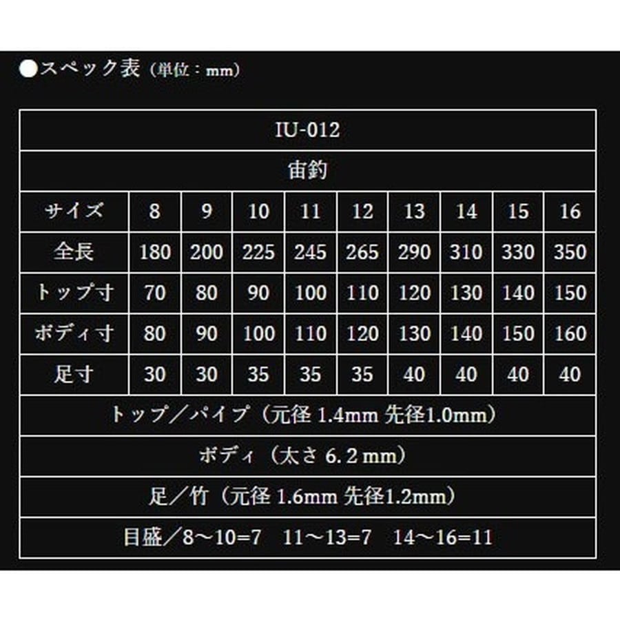 オールシーズン使用可能な宙釣ベーシックモデル。 両ダンゴからセット釣りまで幅広く使えるオールマイテータイプのへら浮子です。★スペック表(単位:mm) サイズ:16 トップ寸:150 ボディ寸:160 足寸:40 全長:350 トップ/パイプ(元径 1.4mm 先径1.0mm) ボディ(太さ 6.2mm) 足/竹(元径 1.6mm 先径1.2mm) 目盛/11
