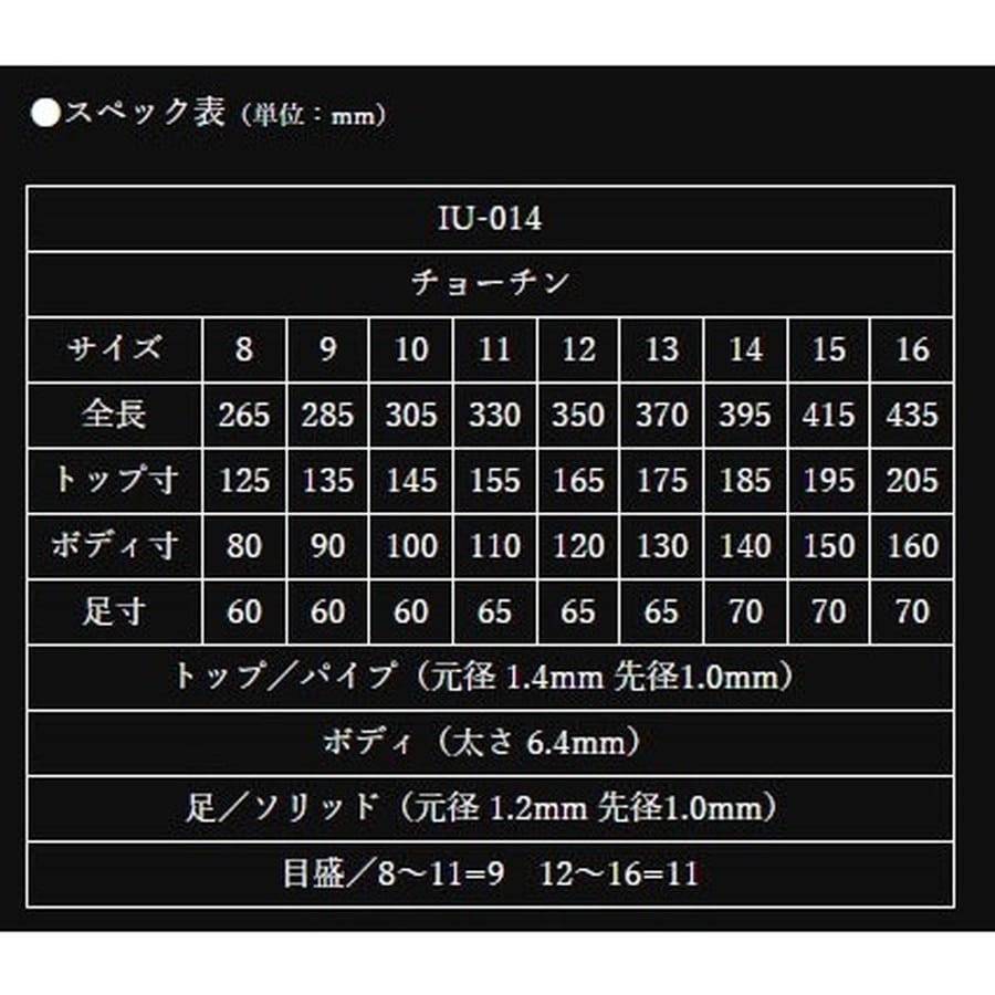 管理釣り場から野釣り場まで幅広く使用可能。 夏はチョーチン、冬は段差の底釣とオールシーズンに対応します。★スペック表(単位:mm) サイズ:9 トップ寸:135 ボディ寸:90 足寸:60 全長:285 トップ/パイプ(元径 1.4mm 先径1.0mm) ボディ(太さ 6.4mm) 足/ソリッド(元径 1.2mm 先径1.0mm) 目盛/9