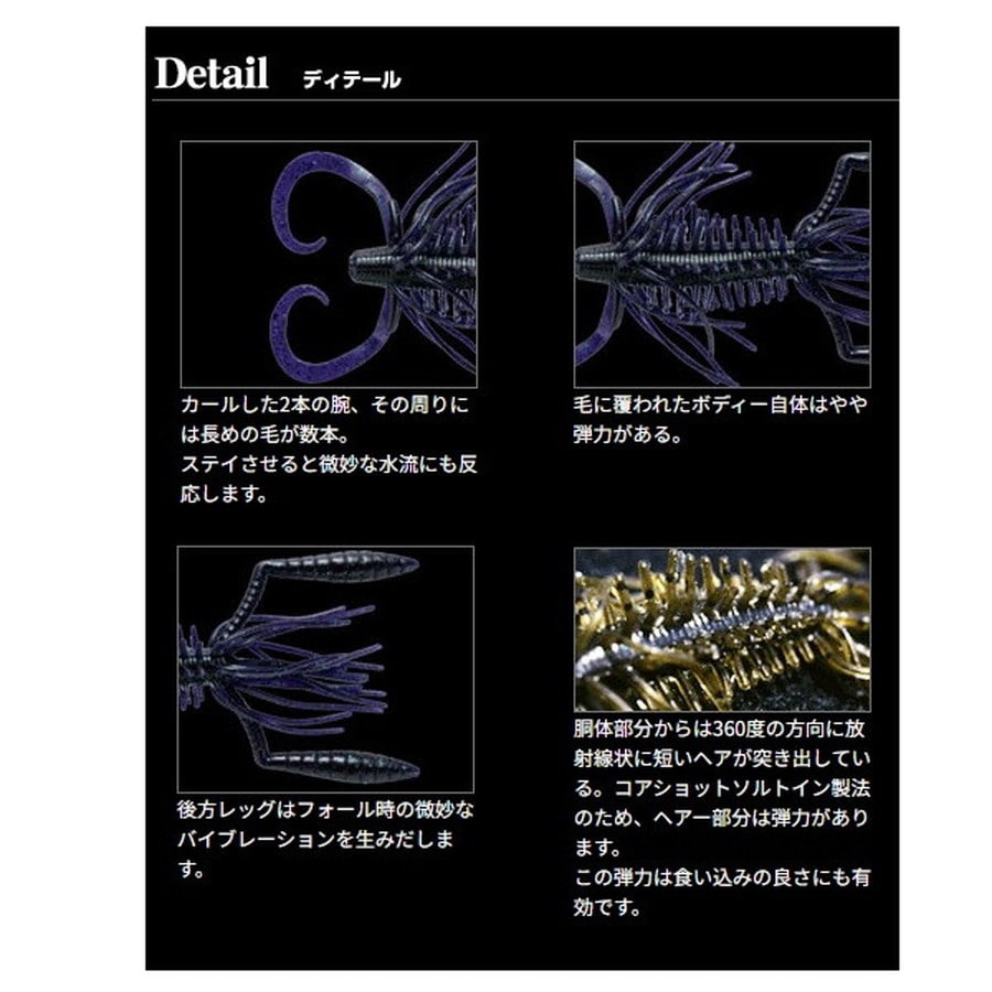 フィネスシルエット&バルキーアピール。水中で自在に形を変え、思わずバスに口を使わせてしまう未確認生物。ヘアリーホッグは全身毛むくじゃらボディ。止めてよし、誘ってよしの万能アピーリーワーム。一見、バルキーでヘアリーなシルエットは、水中では水に溶け込むようにフィネスシルエットに変化。しかし同時に水に絡みつくような全身多毛デザインと2本のラウンドアームのバイブレーションが高い存在感をアピールします。わずかな水流に反応し、常にボディーのどこかが動き続ける自発的動きを持ち、シルエットをぼかすような多毛がバスに見破られにくく、なおかつバスの好奇心を強く刺激します。