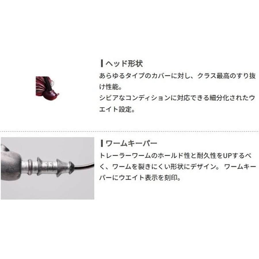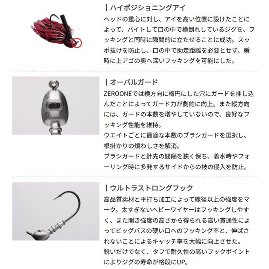 カバージグは実に過酷な使用条件で性能を求められるルアーである。カバーにはナチュラルカバーからマンメイドまで多くの種類があり、四季の中で形まで変わる。そんな中、あらゆる状況下で根掛りしにくいことが良いカバージグの条件である。しかしスナッグレス性能を向上させるためにブラシガードの本数を増やすと、逆にフッキング性能が悪化してしまう。これを改善するために、ブラシガードを根本から徹底研究。その結果、単に真円の穴にガードを植えるのではなく、横長の穴に必要な本数のガードを効率的に配置することがベストと分かった。ゼロワンジグは、この独自のブラシガード新理論と新解明したフッキングメカニズムによって、根掛りしにくくフッキングしやすいという相反する条件を、最高次元でクリアすることに成功した。さらに近年のタフコンディションの中、釣果を伸ばすために必要になるのが誘いの性能。カバーに軽く引っ掛けナチュラルな水平姿勢で止めて誘うことを可能にしたヘッド形状とアイポジションは、確実にバイトを急増させる。