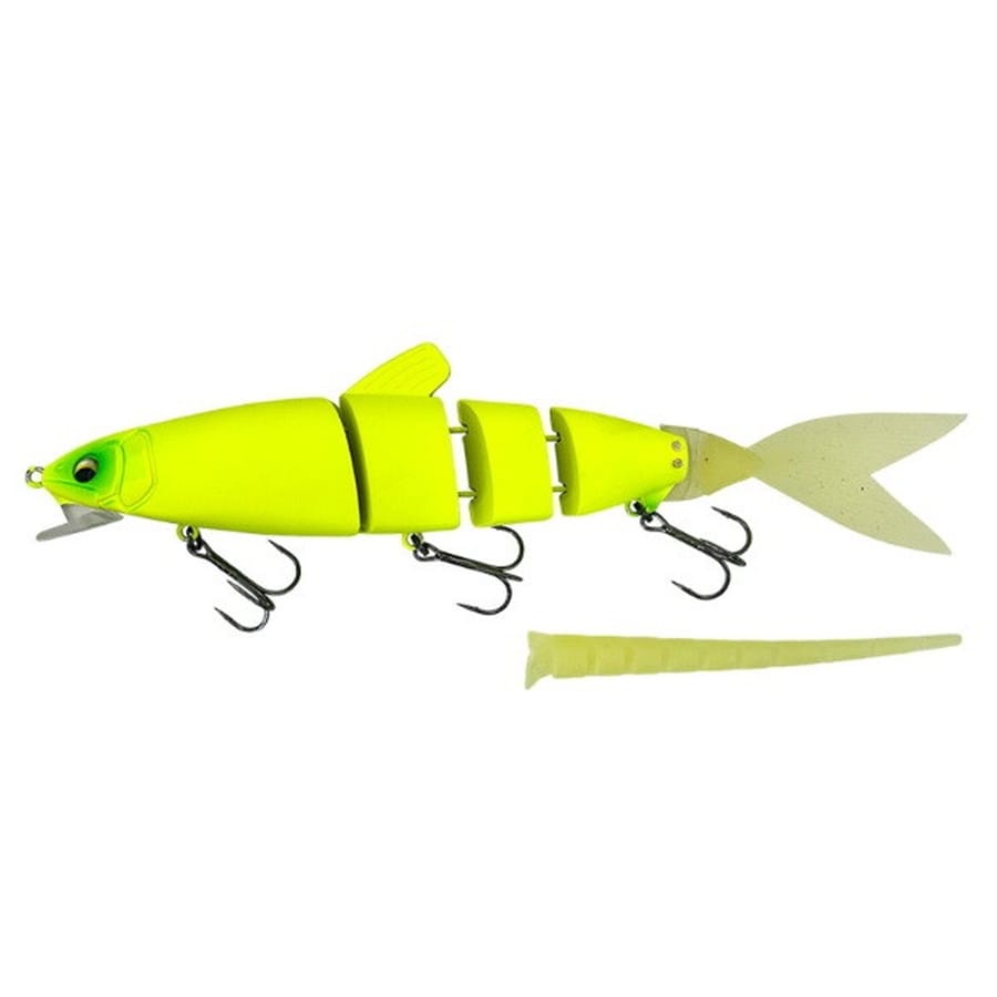 ジャバロンの柔らかくなめらかな生命感にハードベイトならではの力強い水押しとトリプルフックによる高いフッキング率がプラスされたジャバロンハード。復刻以来、十数年前にできたルアーとは思えない釣果を叩き出し、一躍、スタンダードスイミングワームとして返り咲いたジャバロン。しかしジャバロンにも弱点があります。それはワームがゆえの集魚力とシングルフックのステルス効果と比例するフッキング率。オープンウォーターやカレントの中でジャバロン唯一のアクションでハードベイト並みの強い集魚力とキスバイトさえ掛けることができたら…。この悩みに対する飽くなき探究心で生み出されたのがジャパロンハードです。テールもプラスチックからエラストマーに変更し、スネークテールとジャバロンテールの2種類が付属しています。