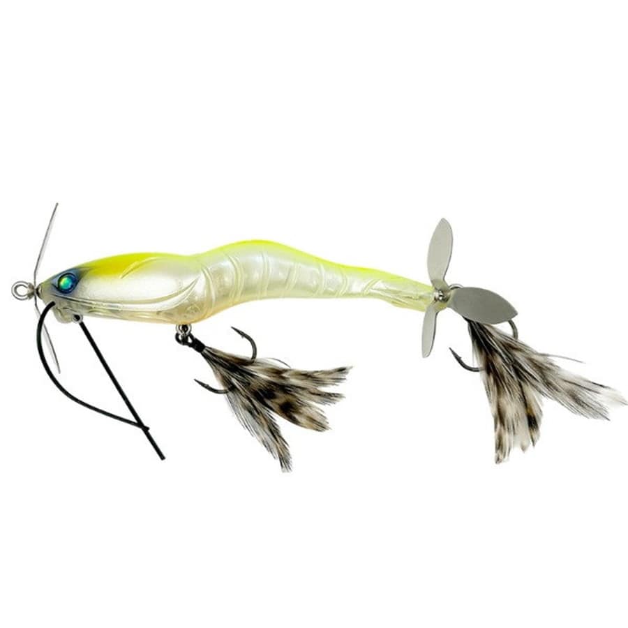 最大の特徴は新開発のイマカツ独自機構『前2枚羽根、後3枚羽根』のシンクロペラ機構。理想を言うならば、前後ともに大きく水を撹拌できる2枚ペラを使えるのがベスト。しかし後方ペラはルアーに当たる水を100%は受けることができない。その理由は前ペラの回転とボディに当たる水流により発生する乱水流。トップウォーターでは水を受ける範囲が下半分になってしまうため、前後2枚ペラの後ペラは前ペラの半分程度の低回転になってしまう。ましてこの手のルアーにとって非常に重要なデッドスローになればなるほど動かなくなる。