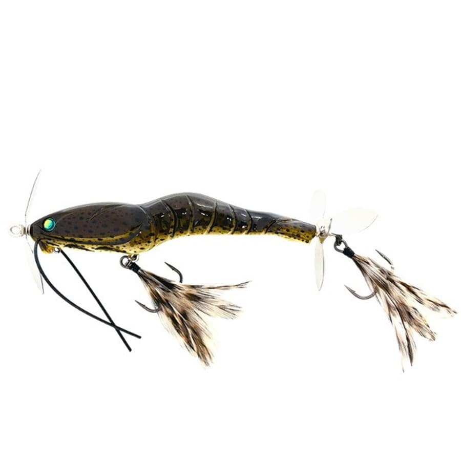 最大の特徴は新開発のイマカツ独自機構『前2枚羽根、後3枚羽根』のシンクロペラ機構。理想を言うならば、前後ともに大きく水を撹拌できる2枚ペラを使えるのがベスト。しかし後方ペラはルアーに当たる水を100%は受けることができない。その理由は前ペラの回転とボディに当たる水流により発生する乱水流。トップウォーターでは水を受ける範囲が下半分になってしまうため、前後2枚ペラの後ペラは前ペラの半分程度の低回転になってしまう。ましてこの手のルアーにとって非常に重要なデッドスローになればなるほど動かなくなる。