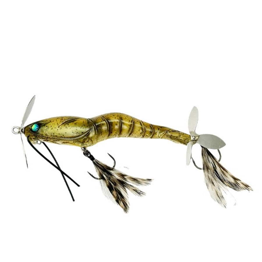 最大の特徴は新開発のイマカツ独自機構『前2枚羽根、後3枚羽根』のシンクロペラ機構。理想を言うならば、前後ともに大きく水を撹拌できる2枚ペラを使えるのがベスト。しかし後方ペラはルアーに当たる水を100%は受けることができない。その理由は前ペラの回転とボディに当たる水流により発生する乱水流。トップウォーターでは水を受ける範囲が下半分になってしまうため、前後2枚ペラの後ペラは前ペラの半分程度の低回転になってしまう。ましてこの手のルアーにとって非常に重要なデッドスローになればなるほど動かなくなる。