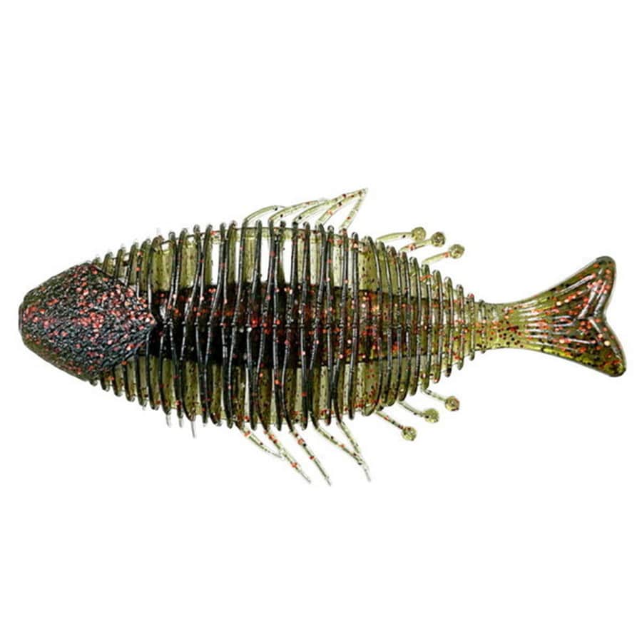 外周をやんわりとエンガワで補強することでリブの乱れを解消。リブ内に空気を保持しやすくなり、アクションさせると気泡がボディから離脱するため、動きの変化と浮き上がる気泡でバスに存在をアピールします。エンガワはルアー全体の水押しを強める役割を果たすだけでなく、ライブソナーにも映りやすくなるという副産物もありました。水中ではリブの隙間に空気をはらむ。動かすと気泡を吐き出すため『息をするギル』ブレスギルになりました。