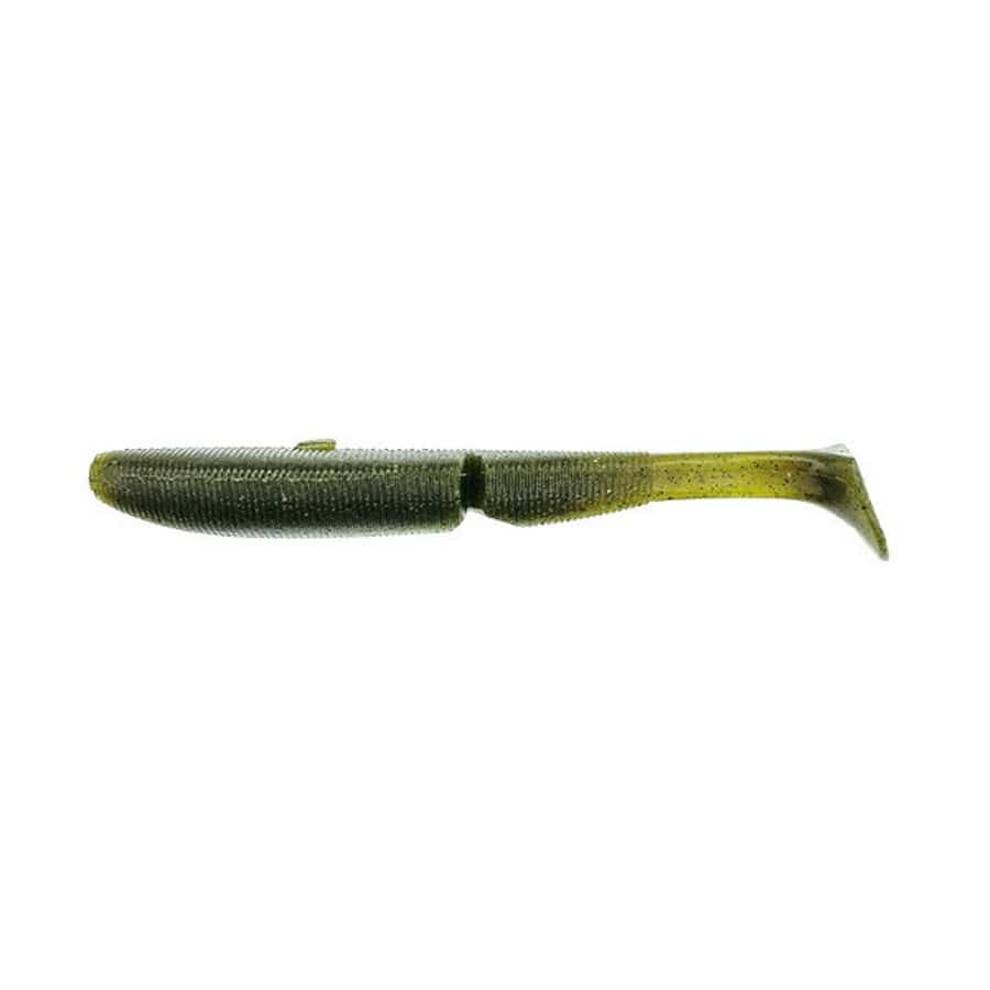 浮き上がりを徹底的に抑制、ノーシンカーでボトムを巻ける。「MJシャッドテールに求めたのは、ボトムをデッドスローで巻けてきっちりアピールできる性能です。それができればシャッドテールはそもそも浮き上がりやすいルアーなので、表層で使いたいときは少し速く巻けばいいだけ」。ジョイント構造にしているのも、ジョイント下部に水を受ける構造も、すべては浮き上がらせにくい性能をもたせるためのデザイン。そして目を引くのがテールの小ささと肉厚さ。「デッドスローリトリーブ時のテールレスポンスを求めたらテールの付け根はあまり薄くせず、テール自体を薄くか小さくするべきなんです。ステルススイマーは薄くして、レスポンスをよくしてキックは弱め。MJはそれとは逆の小さくて強いキックを求めたんです。なにかにコンタクトして抜いた直後のプルプルプルという波動を出せるようにしています」。