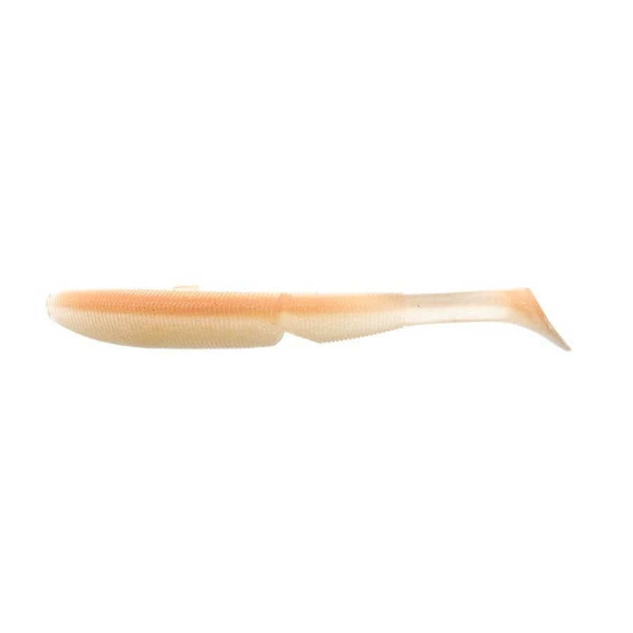 浮き上がりを徹底的に抑制、ノーシンカーでボトムを巻ける。「MJシャッドテールに求めたのは、ボトムをデッドスローで巻けてきっちりアピールできる性能です。それができればシャッドテールはそもそも浮き上がりやすいルアーなので、表層で使いたいときは少し速く巻けばいいだけ」。ジョイント構造にしているのも、ジョイント下部に水を受ける構造も、すべては浮き上がらせにくい性能をもたせるためのデザイン。そして目を引くのがテールの小ささと肉厚さ。「デッドスローリトリーブ時のテールレスポンスを求めたらテールの付け根はあまり薄くせず、テール自体を薄くか小さくするべきなんです。ステルススイマーは薄くして、レスポンスをよくしてキックは弱め。MJはそれとは逆の小さくて強いキックを求めたんです。なにかにコンタクトして抜いた直後のプルプルプルという波動を出せるようにしています」。