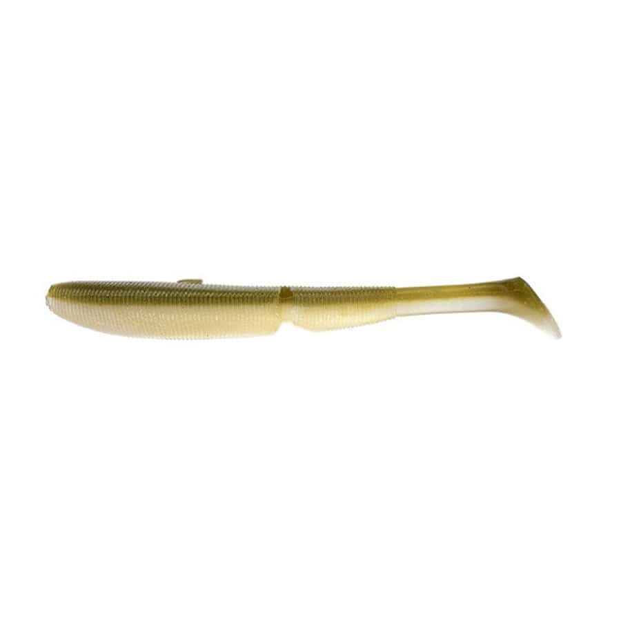 浮き上がりを徹底的に抑制、ノーシンカーでボトムを巻ける。「MJシャッドテールに求めたのは、ボトムをデッドスローで巻けてきっちりアピールできる性能です。それができればシャッドテールはそもそも浮き上がりやすいルアーなので、表層で使いたいときは少し速く巻けばいいだけ」。ジョイント構造にしているのも、ジョイント下部に水を受ける構造も、すべては浮き上がらせにくい性能をもたせるためのデザイン。そして目を引くのがテールの小ささと肉厚さ。「デッドスローリトリーブ時のテールレスポンスを求めたらテールの付け根はあまり薄くせず、テール自体を薄くか小さくするべきなんです。ステルススイマーは薄くして、レスポンスをよくしてキックは弱め。MJはそれとは逆の小さくて強いキックを求めたんです。なにかにコンタクトして抜いた直後のプルプルプルという波動を出せるようにしています」。