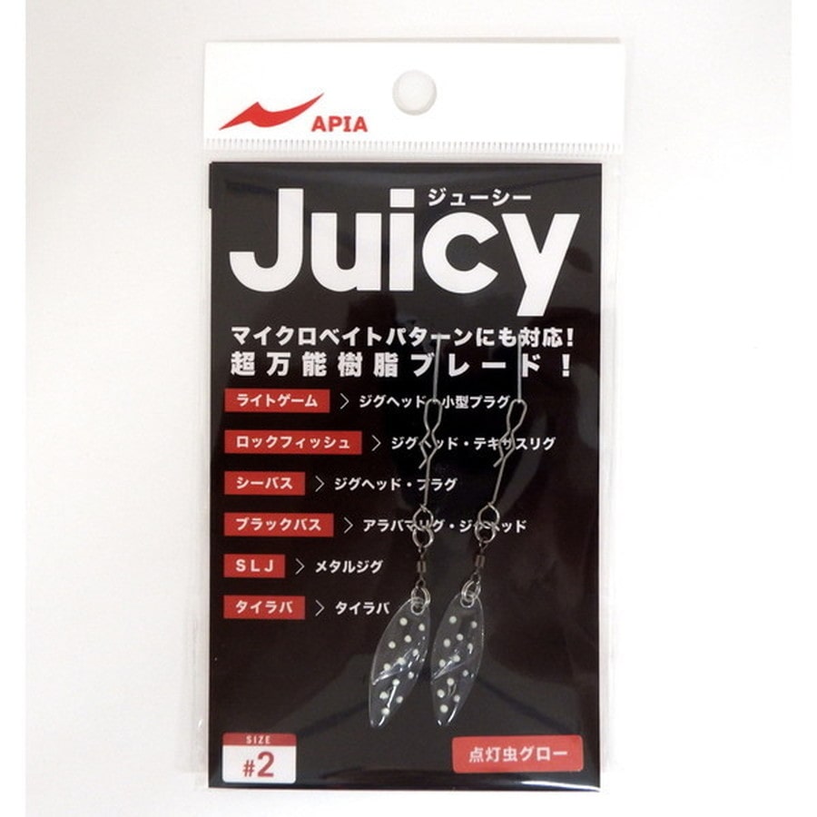 Juicy(ジューシー)の特長は従来の金属性のブレードには無い透明感と軽さである。透明であることで、光の透過と反射でナチュラルにアピールすることができる。UV加工した物は夜中やディープなどの光量が少ない時でも効果を発揮する。比重が軽く垂れ下がりにくいため、スローな誘いも可能。ジグヘッドやオフセットフック・プラグなどに取り付けて使用していただけます。ご自由に使用していただき、様々なリグやプラグのパーツとしてお使いください。