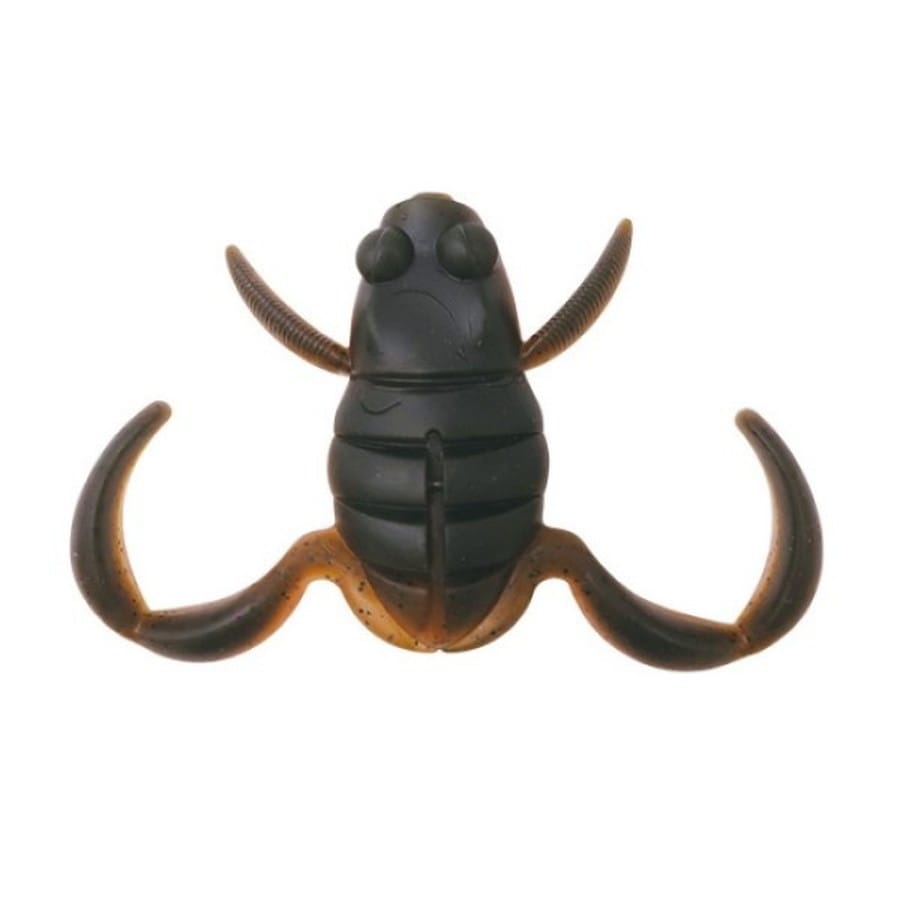 輪切りにしたような断面は水受け面を増やし、強く水を押すだけでなく、移動距離の抑制にも貢献します。そのうえでマグナムは、僅かに傾斜させたカップ形状へと変更。比重の重い太番手フロロラインでの使用を想定し、ダイブしにくくする設計です。また、フックを中心に刺す目安として、口を張り出させています。リアルなキックアクションとナチュラルな波紋を生む、オリジナル形状のレッグ。エスケープアクションが、吊るしを見切るバスにもスイッチを入れます。また、伸びたレッグが戻る動きはブレーキ効果をもたらし、移動距離を抑えた誘いにも貢献。左右に開いたアームはしっかり水を掴んで移動距離を抑えつつ、細かな誘いでもピョコピョコと動いて生命感を増幅します。背と腹にタテ・ヨコ両方のスリットを入れることで、柔軟性を向上。バイト時にはスムーズにフックが露出することで、抜群のフッキング性能を発揮します。浮力と耐久性に富むエラストマーを採用。レッグのレスポンスが鈍るマグナムサイズでもイキイキとしたアクションを生む素材硬度を選択しています。