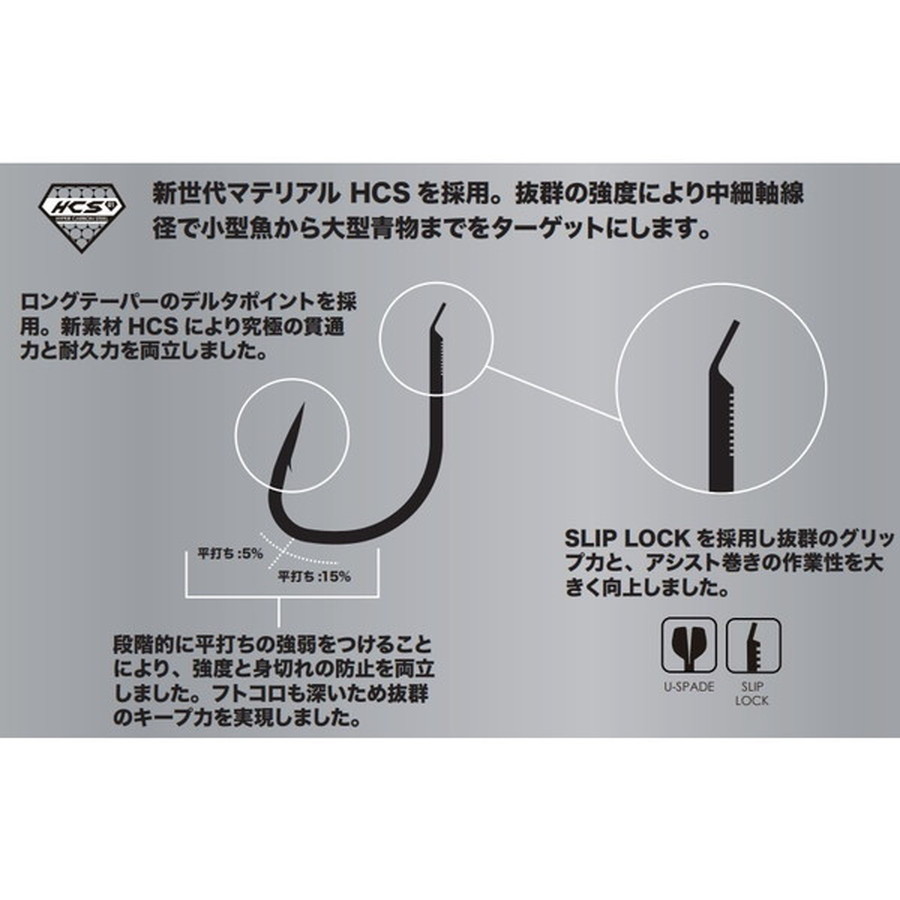 触れたら即掛け !! 抜群の初期掛かりをパワーロスなく貫通!近海青物をベースに開発した先鋭速攻デザインのジギングフック!・近海青物をベースに開発した先鋭速攻デザインのジギングフック。・触れれば即掛け、一瞬のコンタクトを逃さない LONG TAPER & DELTA POINT!・次世代新素材 HCS を採用、更に BKK 独自の SPECIAL FORGING により圧倒的な強度とファイト時のキープ力を実現。・BKK のテクノロジーを集約した JAPAN STANDARD FASTHOOK が誕生しました。・HCS の効果により、フッキング時にパワーロスなく真っ直ぐ深く貫通します。