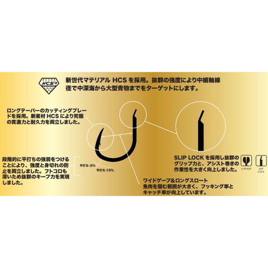 ・スロージギング対応オール パーパスジギングフック。・反転、フォールバイトを仕留める LONG TAPER & CUTTING BLADE !・HCS を採用し BKK 独自の SPECIAL FORGING により圧倒的な強度とファイト時のキープ力を実現。・BKK のテクノロジーを集約した JAPAN STANDARD SLOW HOOK が誕生しました。・特徴的な形状と HCS の効果により、魚体の奥深くに抉り込むように貫通します。