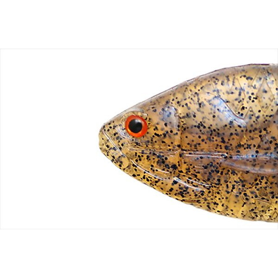 ブルーギル型ボリュームによる集魚効果と、オールマイティに使えるウェイトに注目した、ブルーギル型ワーム。カルティバ製マルチオフセット#4/0に合わせてボディを設計しました。ボディに対して垂直(横向き)にフックセットしますが、背部の空洞による浮力と、ネイルシンカーによるバランス取りによって、魚が泳ぐ姿勢やアクションを表現します。また、その空洞により、フッキングの良さも併せ持っています。ネイルリグの他、テキサスリグや、キャロライナリグなど、あらゆるメソッドに対応します。新開発のキャラメルスケール設計(PAT.P)ボディによる見た目のリアル感と、艶かしいS字アクションが特徴です。