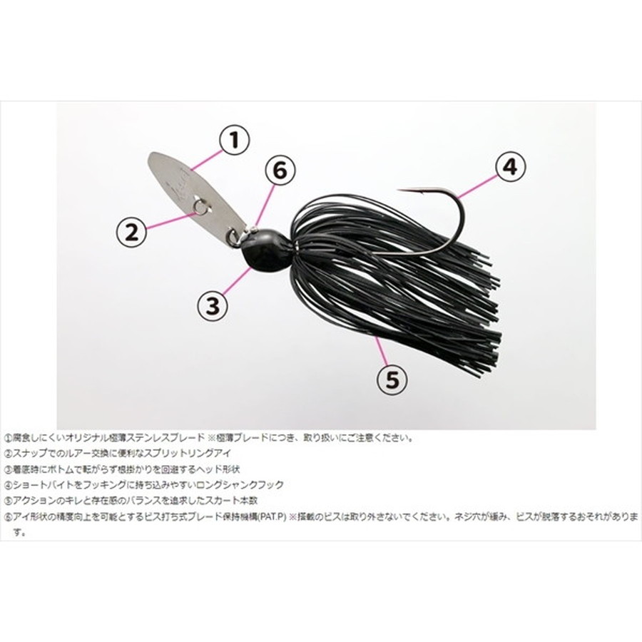 チャターベイトの強みは、強波動、強振動による 『魚を呼ぶパワー』。AKチャターは 『魚を呼ぶパワー』をより高めるべく、オリジナル極薄ロングブレードを搭載。効率よく水を掴むことで、ファストからスローリトリーブまで様々な速度域で釣れる振動をキープします。さらに、ブレードのポテンシャルを最大限に引き出すため、ヘッドとアイのバランスを最適化。ボディ全体をハイピッチに揺らすタイト千鳥アクションが魚を呼び、バイトに持ち込みます。安定感の高いヘッドはボトムでの転がりを減らし、着底時の根掛かりを回避。ウェイトに対して浮き上がりが良いため、ワンランク軽いチャターベイトと同じレンジをトレース可能です。ブレード保持機構には、ビス打ち式(PAT.P)を採用。従来のワイヤー曲げ込み式と比較し、アイ形状の精度向上が可能となったことで、AKチャター本来のポテンシャルを引き出すことに成功しました。