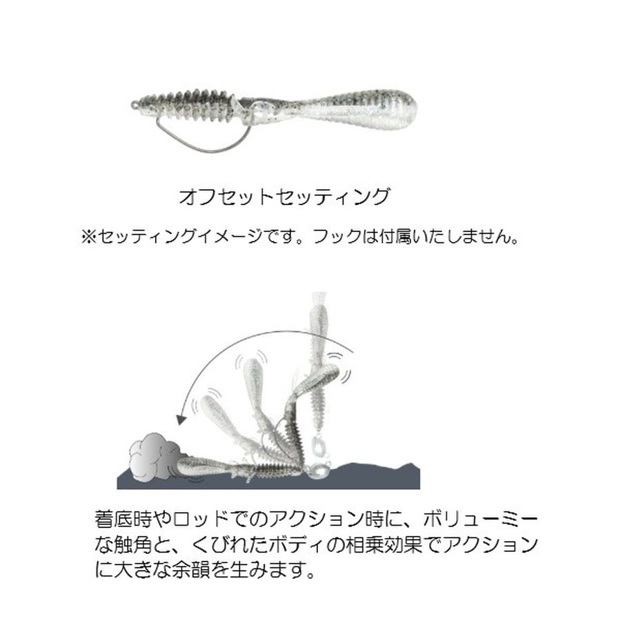 甲殻類を捕食する魚の多くを魅了する『ジャコバグ』。その特徴である太い触角が「パワフル触角」としてボリュームアップ! 簡単にこれまで以上の強い存在感と波動を水中で放ちます。強いアピール力が欲しい、大物を狙いたい、深場、急流場、濁りの中でもワームをアピールしたいときに投じてください。