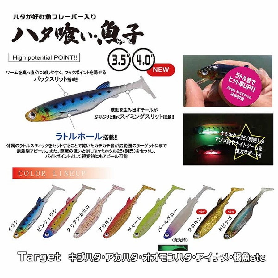 魚食系パターンの際に絶大な効力を魅せるシャッド系ワーム。これに小魚がフィッシュイーターから狙われ、パニック状態で逃げ惑う際の「カチカチ音」をラトルで忠実に再現!! 広範囲のターゲットに存在をアピール、また、バイト本能をダイレクトに刺激する強アピールタイプのワームである。※掲載している商品の画像は代表画像を表示しています。また実物と色が違って見える場合があります。あらかじめご了承下さい。